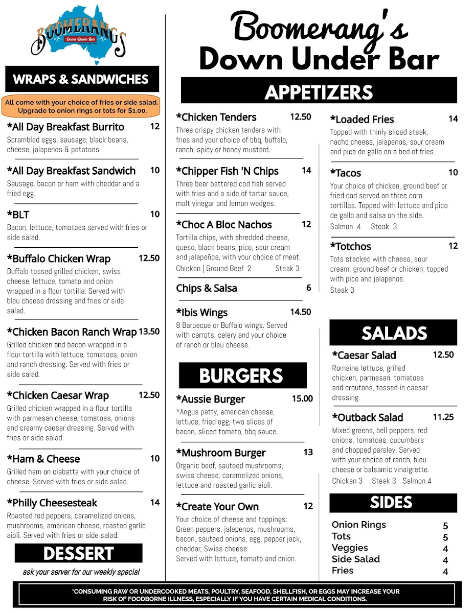 Welcome to Boomerangs Down Under Bar, a vibrant and inviting dining spot nestled in the heart of Salt Lake City at 160 S Main St. Known for its eclectic mix of Australian-inspired fare and a lively atmosphere, this bar promises to be a memorable destination for locals and visitors alike.